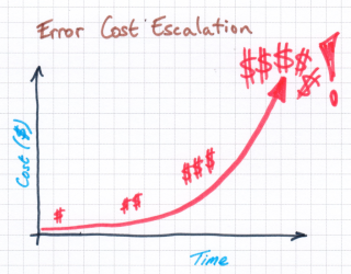 Ever since I started my career in the semiconductor industry, the seemingly tacit knowledge that errors found later in a project cost exponentially more to fix seemed to be a staple of every marketing person's slide-set. The aim, it seemed, was to instil fear into all potential customers that, if they were to opt for the "cheaper" (read "inferior") competitor product, then there would be costs to pay later on during the product's development. You can sort of imagine it as a pirate treasure map with a "Here be dragons!" scrawled in blood in the top right corner, just where X marks the spot.