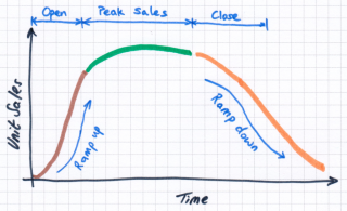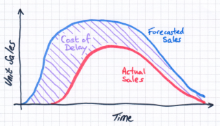 The result of this is that the "time to sell" becomes shorter, due to late market entry. In addition, and perhaps more worrying, is that the estimated peak sales will no longer be attained since the customers that they were attributed to turn to other suppliers for the duration of their projects for which the solution is useful. The result is that the total sales that made up the ROI of marketing's forecast, the area under the curve, becomes successively smaller the later the project becomes.