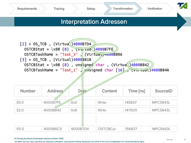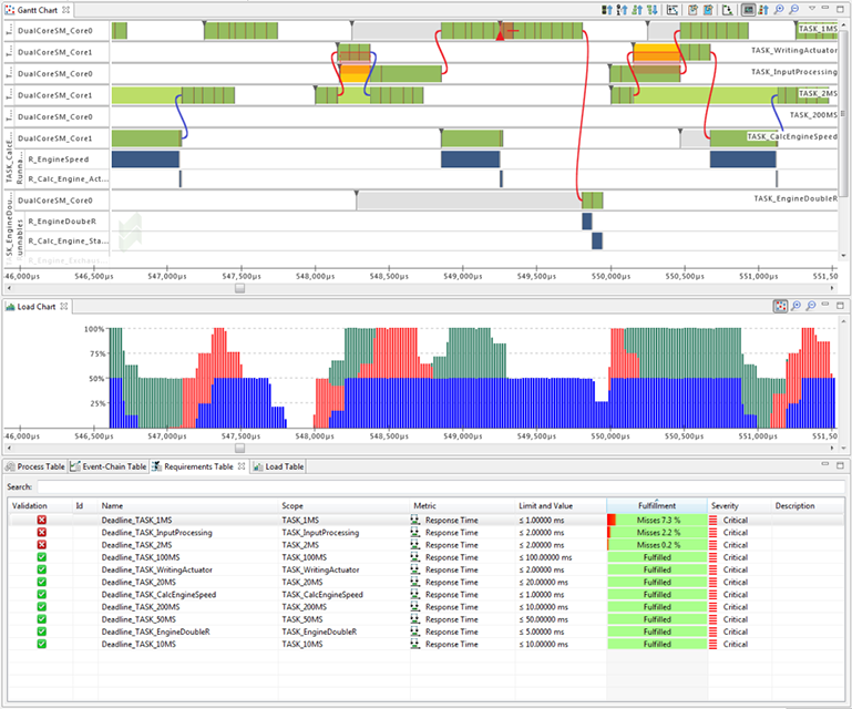 After suitable modifications had been made to provide a more conformant registration of operating system task states, it was possible to record the hybrid trace data during active use of the steering wheel, during which the wheel was turned to the full extent of its travel. The raw trace data then required one further step to transform it into the Best Trace Format (BTF) format required for further analysis. This involved making use of the knowledge of the addresses certain structures and variables had been assigned, or inserting definitions in the place of raw data values. Timing Architect’s Inspector tool could now be used to analyse the performance of the steering system during actual use and provide feedback on whether the timing requirements were being fulfilled. Furthermore, it was possible to integrate this testing into the Jenkins Continuous Integration (CI) environment to allow automated timing measurements to be undertaken on all further software changes. At last the development team had the necessary tools available to determine which software changes were causing unacceptable utilisation demands on the core and the necessary teams could be informed upon the impact their code was having.