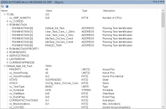 A snap shot of the status of all OS objects described in the ORTI file can be displayed via the OS Objects view. This view is accessible in winIDEA via the View, Operating Systems, Objects menu. For multi-core applications a multi-core ORTI file can be generated in Vector DaVinci Configurator by selection ORTI Debug Support ORTI_23.