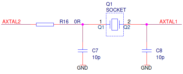 Separately packed 20 MHz crystal can be used as a 20 MHz external clock (XOSC) source to the emulation device. If a different clock frequency is required, insert appropriate crystal into the Q1 socket and replace C7 (default 10 pF populated) and C8 (default 10 pF populated) accordingly. Crystal socket Q1 is by default not populated (NP). |
