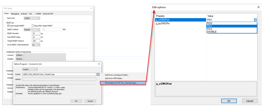 Example: Open Hardware menu / CPU Options / Reset tab. After adding initialization script from the SFR folder click the arrow button which opens Edit options dialog, where parameters can be selected from the drop-down menus.